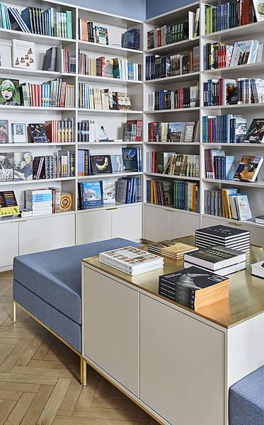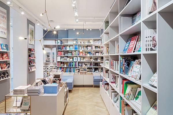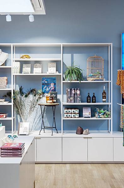 整體裝潢以米白與灰藍二色搭配,營造明亮清新氛圍,設計概念更符合先前所提簡約與實用原則,商店內規劃大量系統櫃及多功能組合家具,除了陳列販售商品,同時分區收納藏放庫存,一石二鳥。