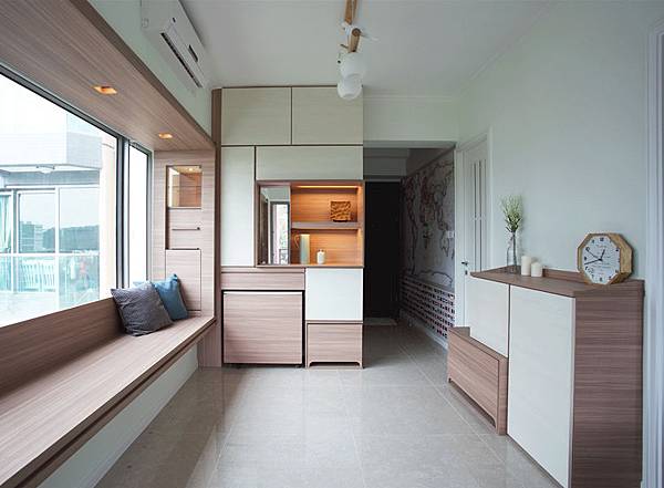 牆面高櫃及鞋櫃都配有移動式的長凳坐椅,用餐、聚會時,從櫃下抽出,不需使用時,收拾歸位不佔空間。多功能變形家具的設計,替這個家帶來便捷。