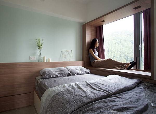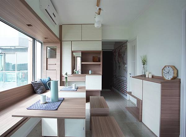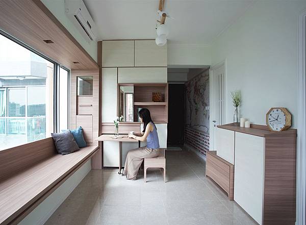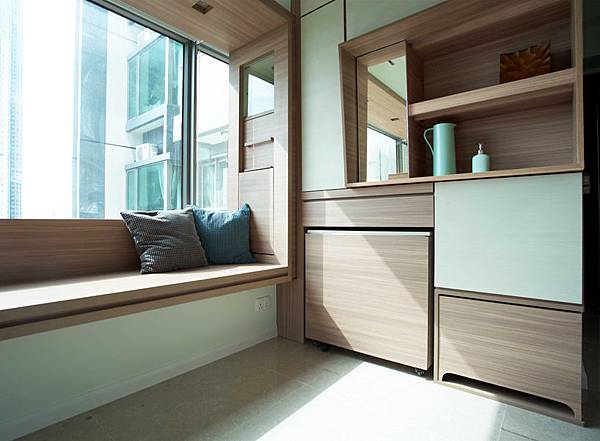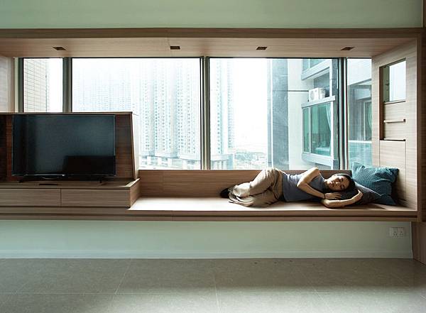 座落香港海灣附近半山腰14坪小公寓,由Sim-plex設計工作室規劃設計,主要藉由系統家具使空間極小的住所最大化利用。