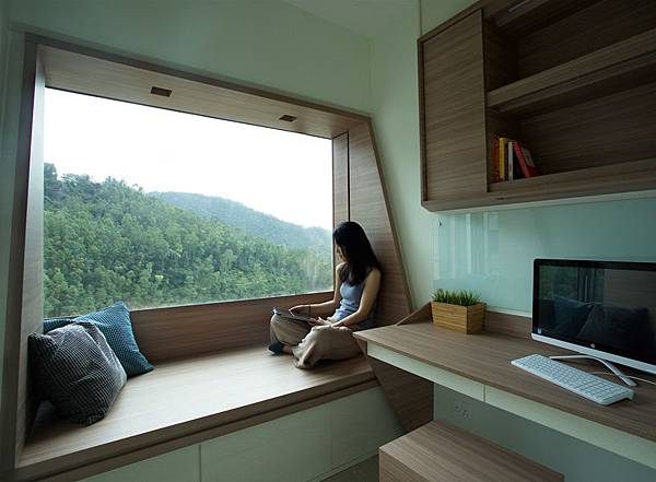 客廳一大海景飄窗(外凸窗)是此區域亮眼特點,不僅可觀賞美麗景緻,也讓室內採光特好。此處電視櫃、長凳、書架、玻璃展示櫃與照明設備全以窗台為中心延伸,利用系統櫥櫃依空間構造量身打造之特性,訂製恰好尺寸家具,點滴不浪費。