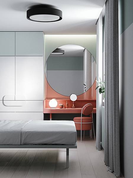 1. 以圓型作為梳妝檯主題,掛鏡、立鏡、坐椅、器皿充滿弧線美,玫紅挹注進灰色空間,猶平素清新臉蛋,施上清淡胭脂的小女子般好看。