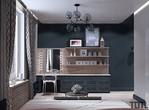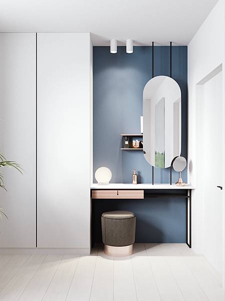 12. 藍色儲物櫃結合梳妝台、開放式收納層架,別於一般梳化間/區域設計,類似於歐式廚房多功能收納樣式,海軍藍配色充滿濃濃巴黎味兒。