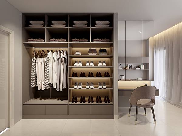 3. 衣櫃延伸相連一隅化妝台,外形規劃整齊,舒適療癒。化妝台收納櫃外側直接貼覆鏡面,米白與摩卡配色簡約時尚。