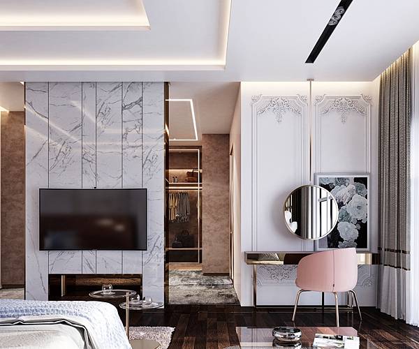 4. 金碧輝煌的臥式設計,採用許多奢美晶亮素材:大理石、金銅、玻璃,打造裝飾、收納;梳妝區,從天垂吊的大圓鏡、金屬材桌椅,替主臥再添一筆華麗評價。