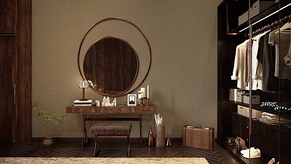 5. 巨大造型鏡一下子衝進了視線,震懾觀感,沉穩顯貴氣的古銅(棕銅)、胡桃木元素一統房內設計,擁抱迷人文藝氣息。