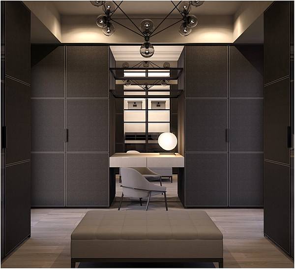 7. 櫃與櫃間,安插化妝區,更衣間裡的對稱設計,安穩舒適;黑色皮革紋衣櫃,米白織布紋抽屜、現代吊燈,從容優雅,具英倫氣質。