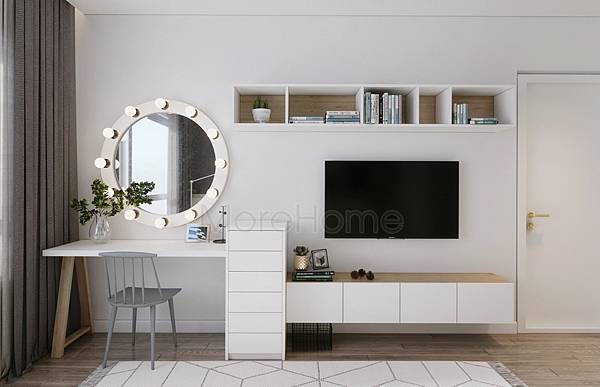 10. 小坪數小資公寓,不能造個夢想中寬敞的梳化間,還是可以藉量身訂製的系統家具,做出一體成型的化妝桌、電視櫃,純白與木紋共同展現清爽明亮北歐風味。
