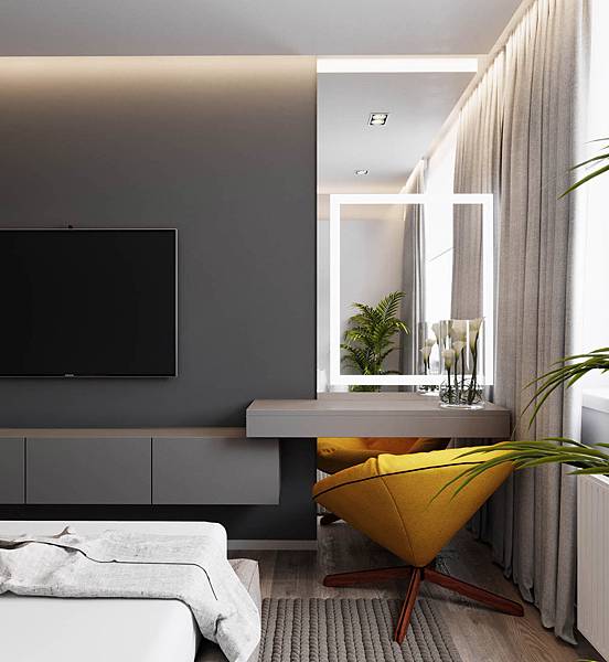 13. 北歐風的時尚感設計的臥房,牆面、電視牆、化妝台、寢具、地毯、窗簾等,一律為灰色系妝點,黃色沙發椅點亮梳化區,添增活力元氣感。