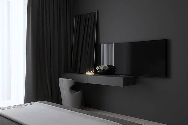 2. 圖1若太夢幻、搶眼,圖2灰藍表現中性、平靜低調感,暖色木紋、黑鐵配件相得益彰,長掛鏡成為區域焦點。