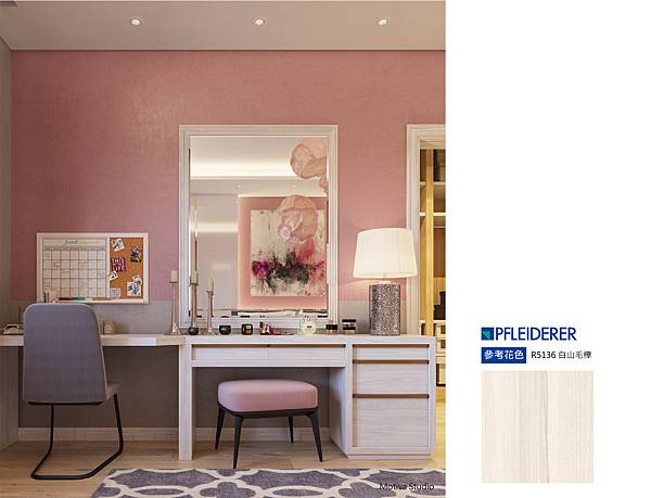 8. 多數女孩無法抵抗的柔美粉紅設計,白色木紋化妝台系統櫃修飾,整體不過於甜膩。